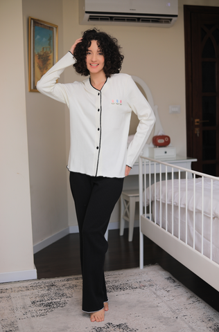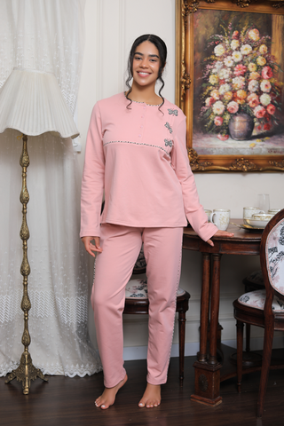 يجامة شتوية راقية تجمع بين هدوء الرمادي وأناقة الكافيه في تصميم ناعم يبث إحساس بالدفء والراحة. الجزء العلوي يتميّز بقماش دافئ ولمسات تطريز بسيطة تعطي شكل فاخر بدون مبالغة، مع أكمام مريحة تناسب الجلسات الطويلة. البنطلون...