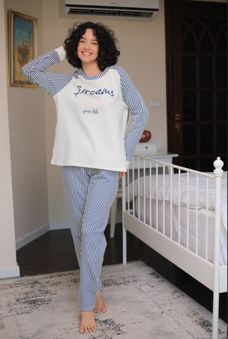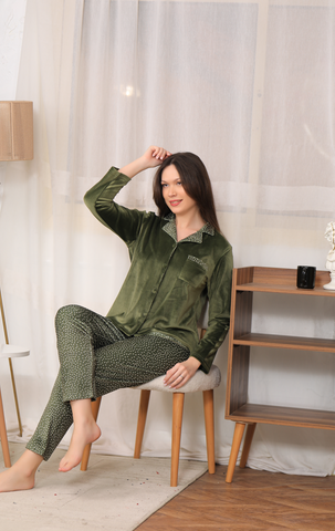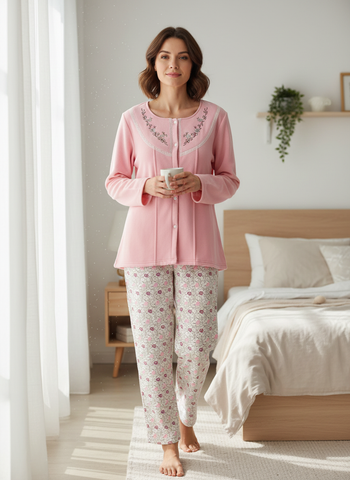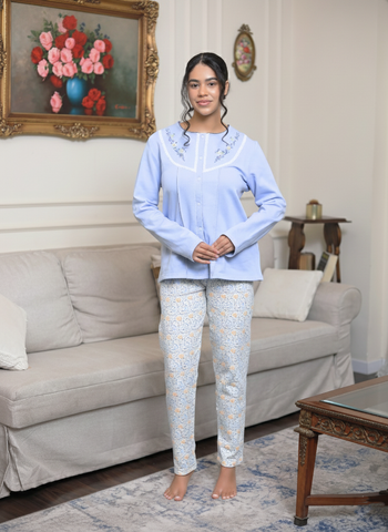 تنساب هذه البيجامة عليكِ كما ينساب ضوءُ المساء في آخر النهار،ناعمةٌ، هادئة، تحمل في خيوطها سكينةً تُطفئ برد الشتاء. تلتفّ حولكِ برفقٍ يشبه حضن غيمٍ دافئ،وتُلبسكِ حالةً من الهدوء لا يشبهها شيء،كأنكِ لحظةُ استراحةٍ جميلة...